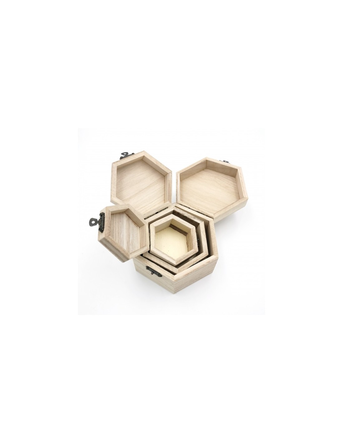 Set di 3 scatole esagonali in legno grezzo, perfette per il fai-da-te. Personalizzabili con decorazioni uniche per regali speciali o per l’organizzazione.